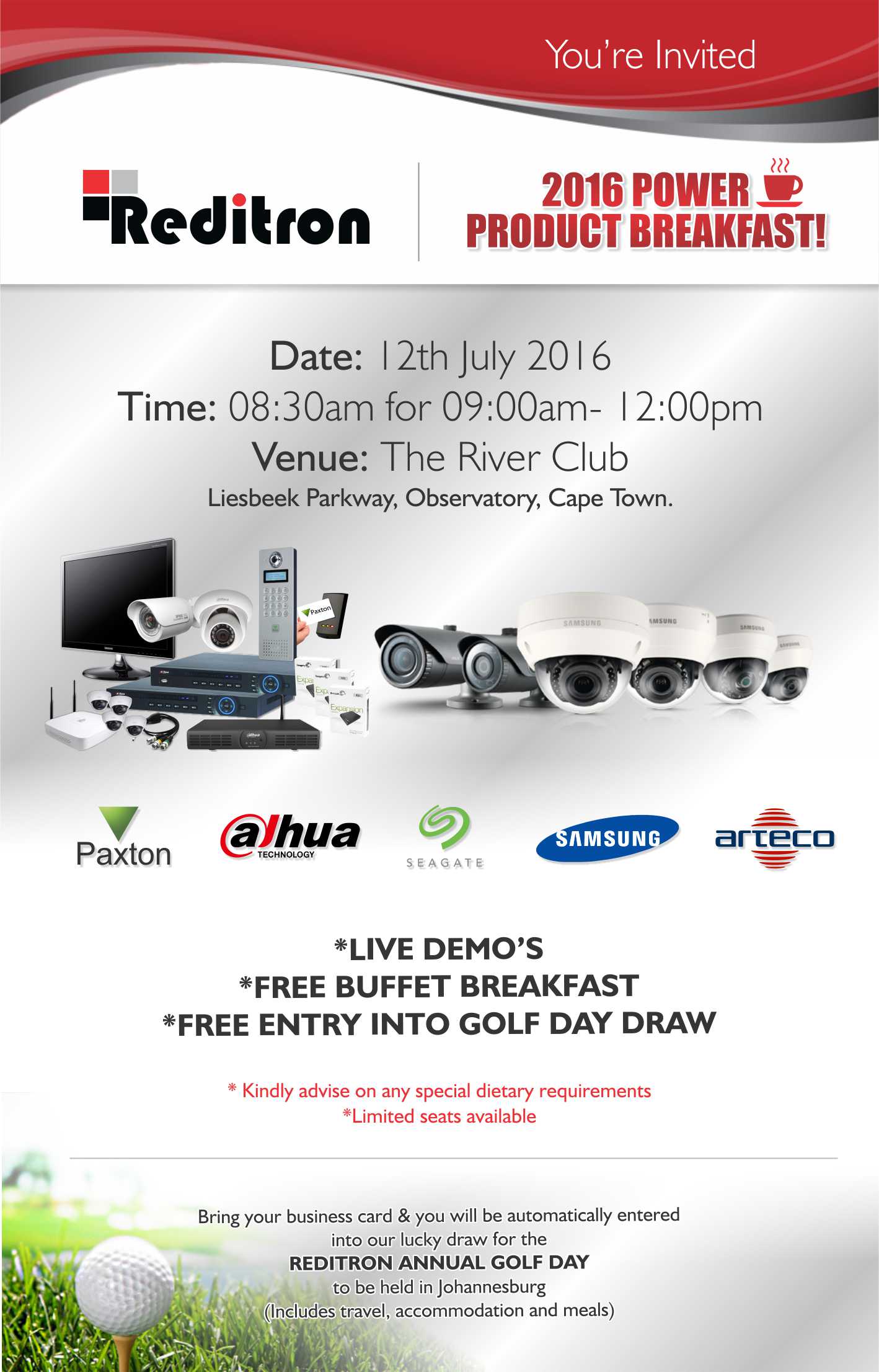 Reditron Cape Town looks forward to inviting you to our annual Power Product Breakfast roadshow. Showcasing live demo's of products of as well as a FREE buffet breakfast taking place at The River Club on the 12th July 2016 at 09:00am until 12:00pm. Customers who bring their business cards will also be automatically entered into our lucky draw for the Reditron Annual Golf Day, to be held in Johannesburg (Travel, accommodation & meals all included).